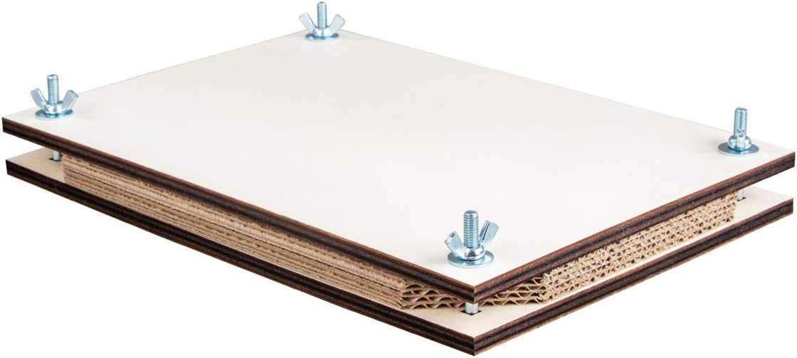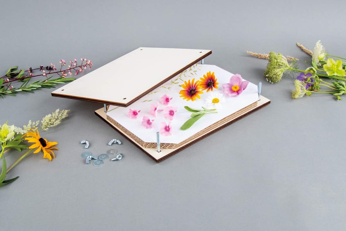 Ideală pentru arta florală presată. Pur și simplu aranjați flori, frunze, petale, ierburi și multe altele pe hârtie absorbantă, puneți o altă hârtie sugativă deasupra. Așezați sandvișul de hârtie între foile de carton. Adăugați placa superioară și strângeți-o cu piulițele cu aripioare.